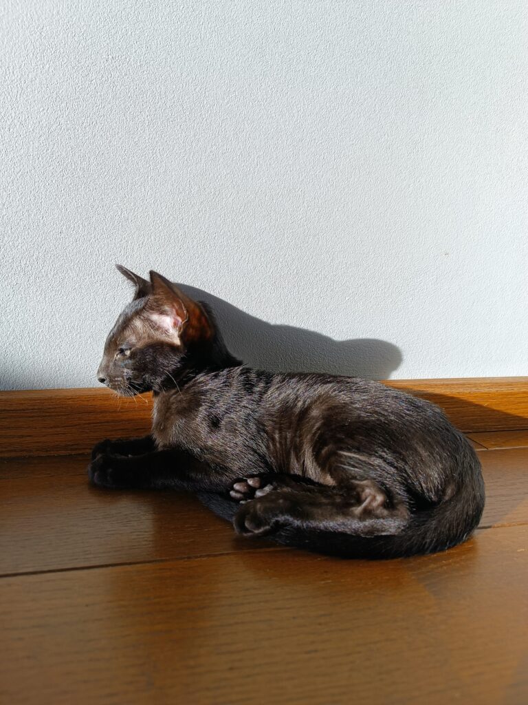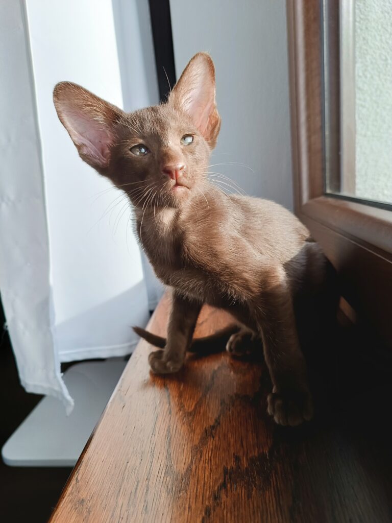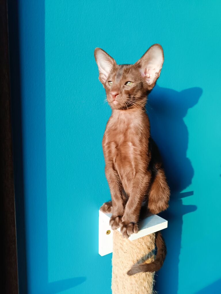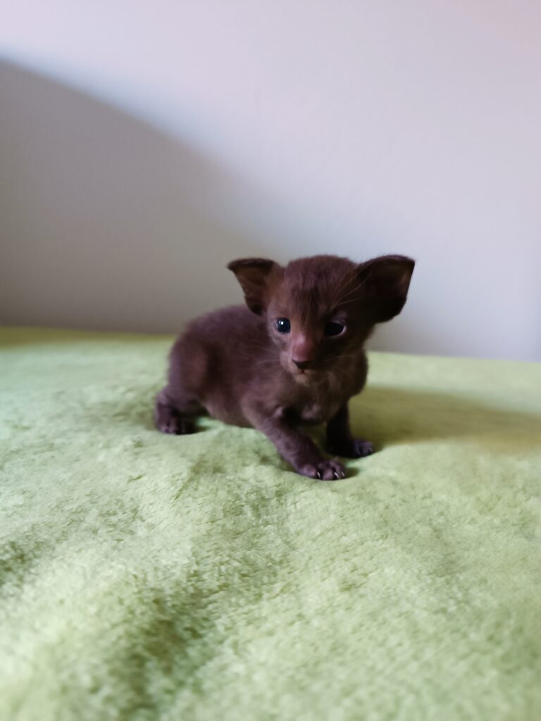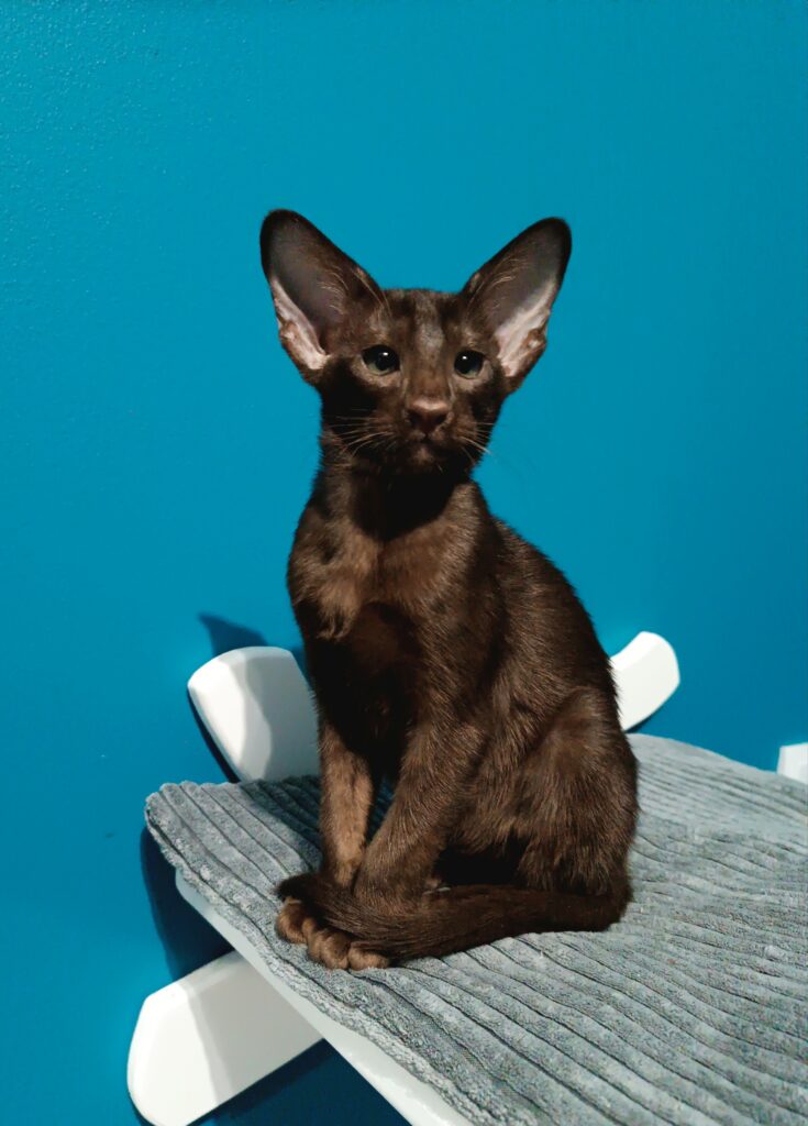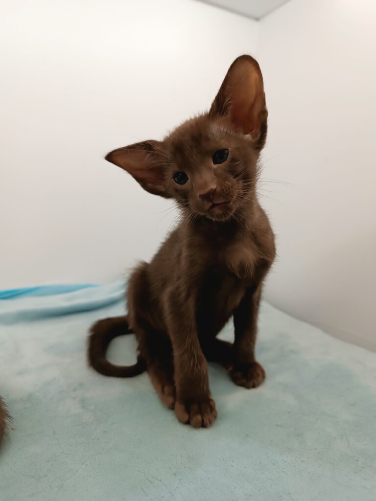 Freya – czekoladowa koteczka orientalna. Największy pieszczoch z miotu, nie schodziłaby z kolan. Zostaje w hodowli.