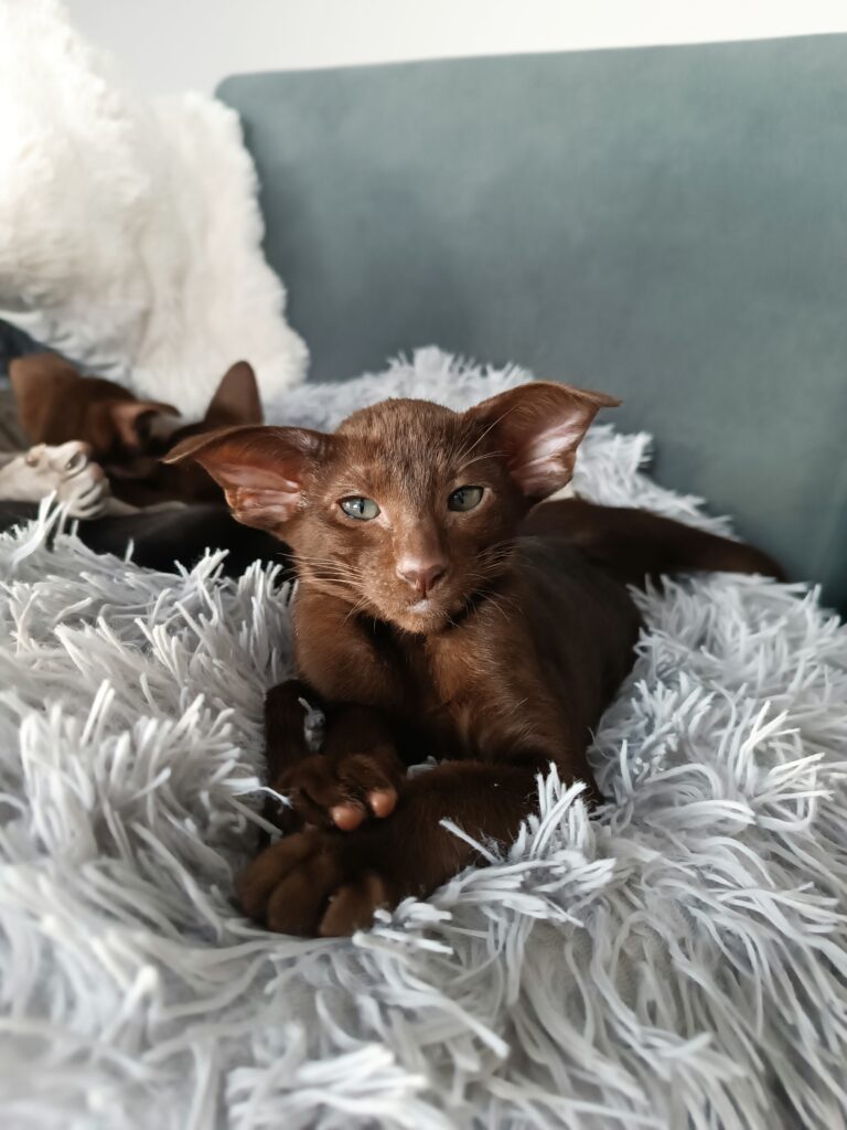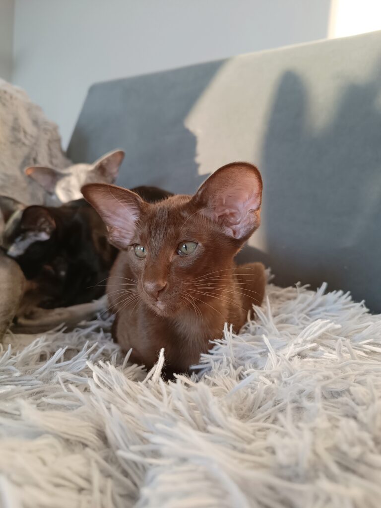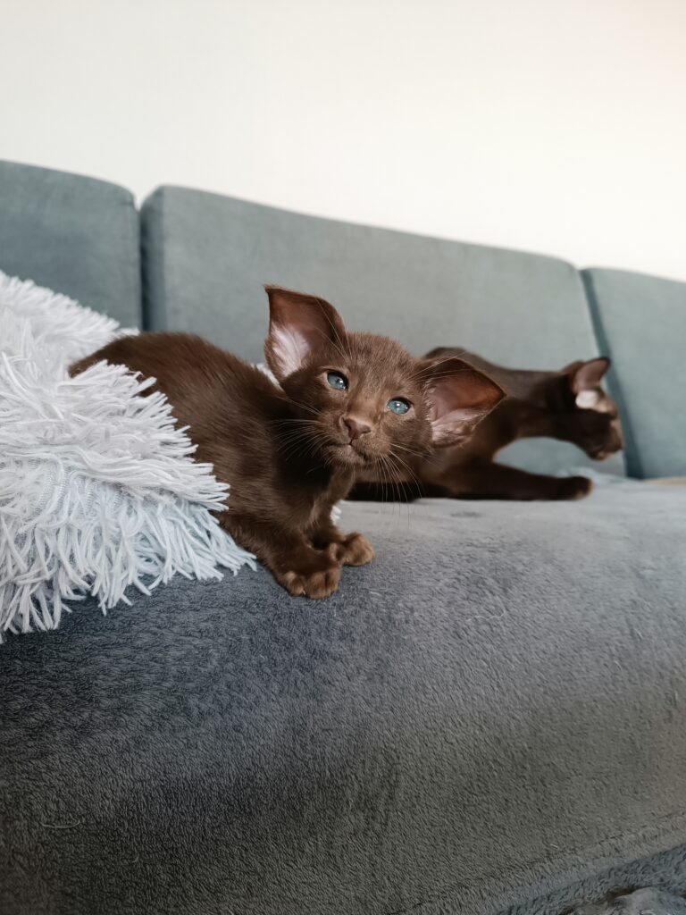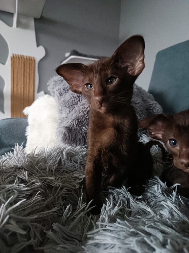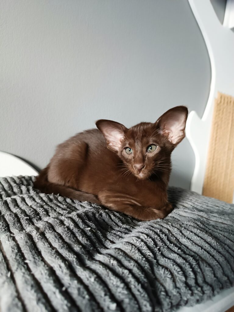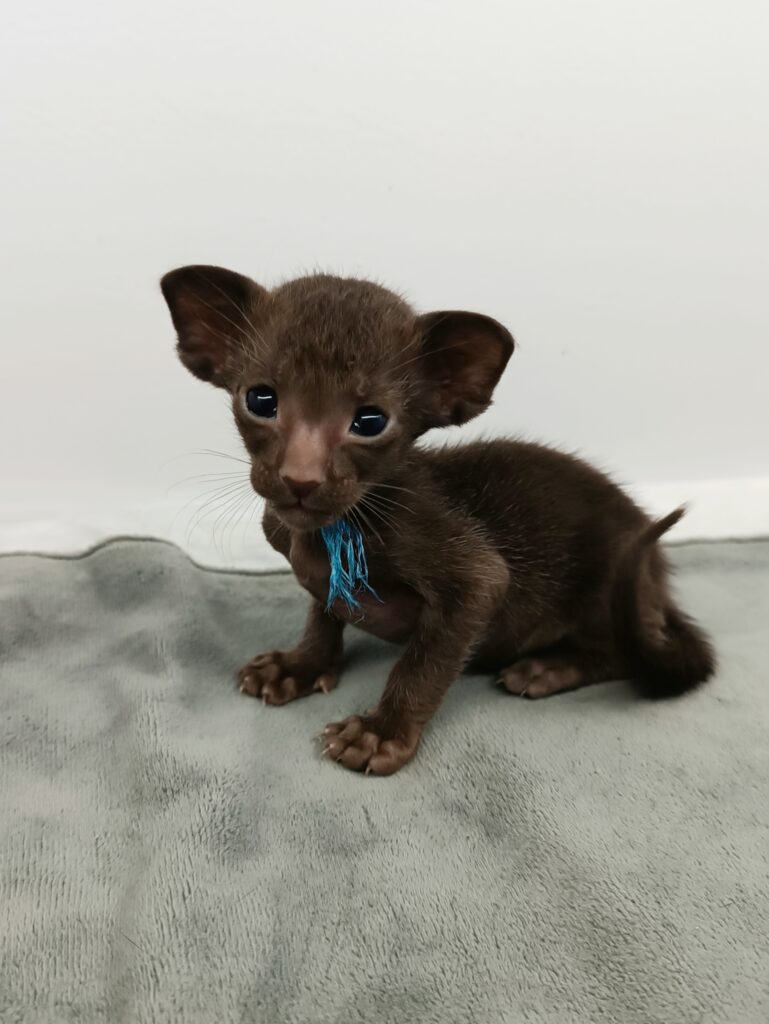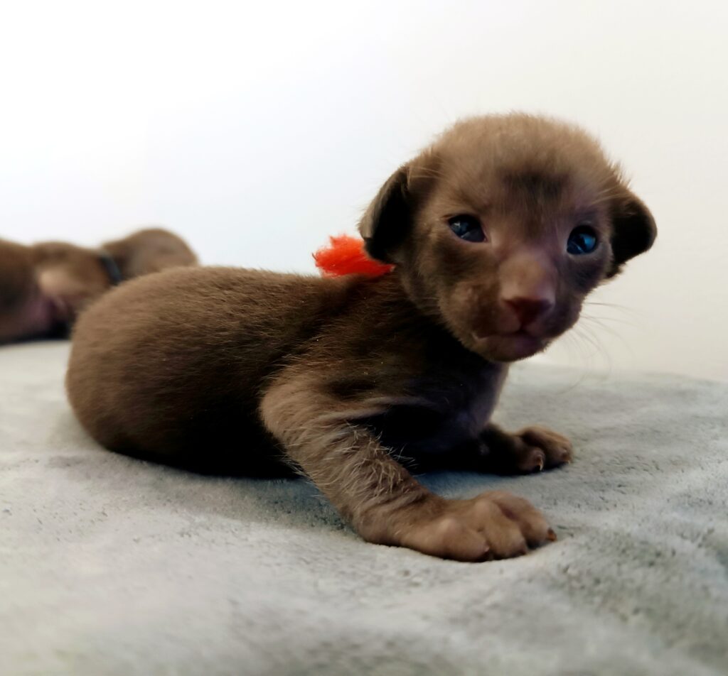 Irma – czekoladowa kotka orientalna (czerwony znacznik) – największy rozbójnik i miłośnik głaskania wśród rodzeństwa. Po domowemu Buła ze względu na swoją tuszę w okresie noworodkowym 😉 Rezerwacja