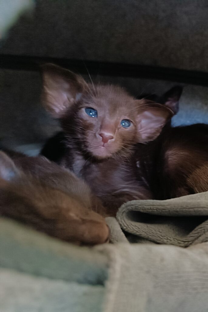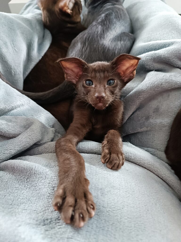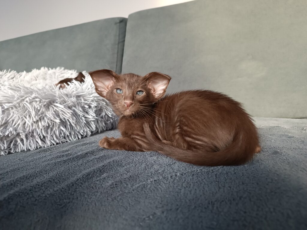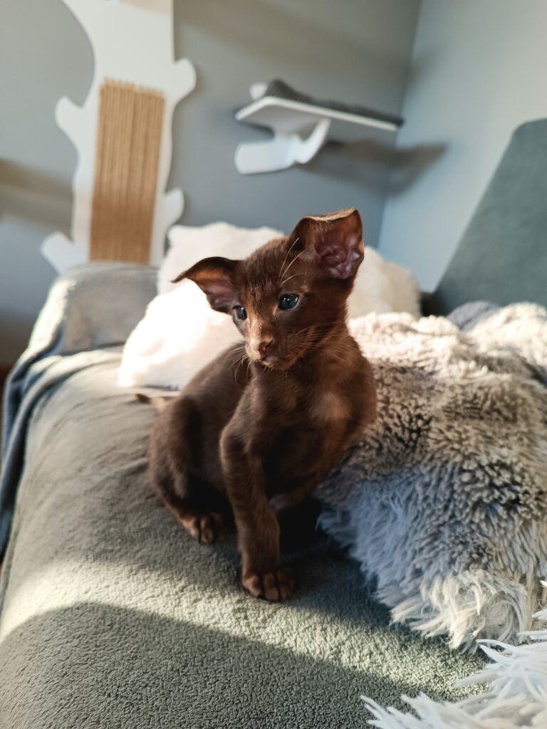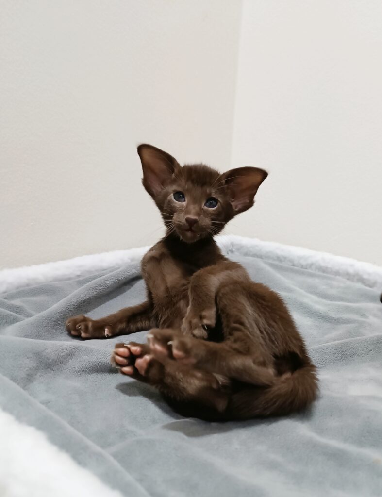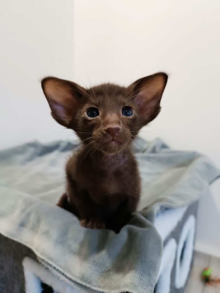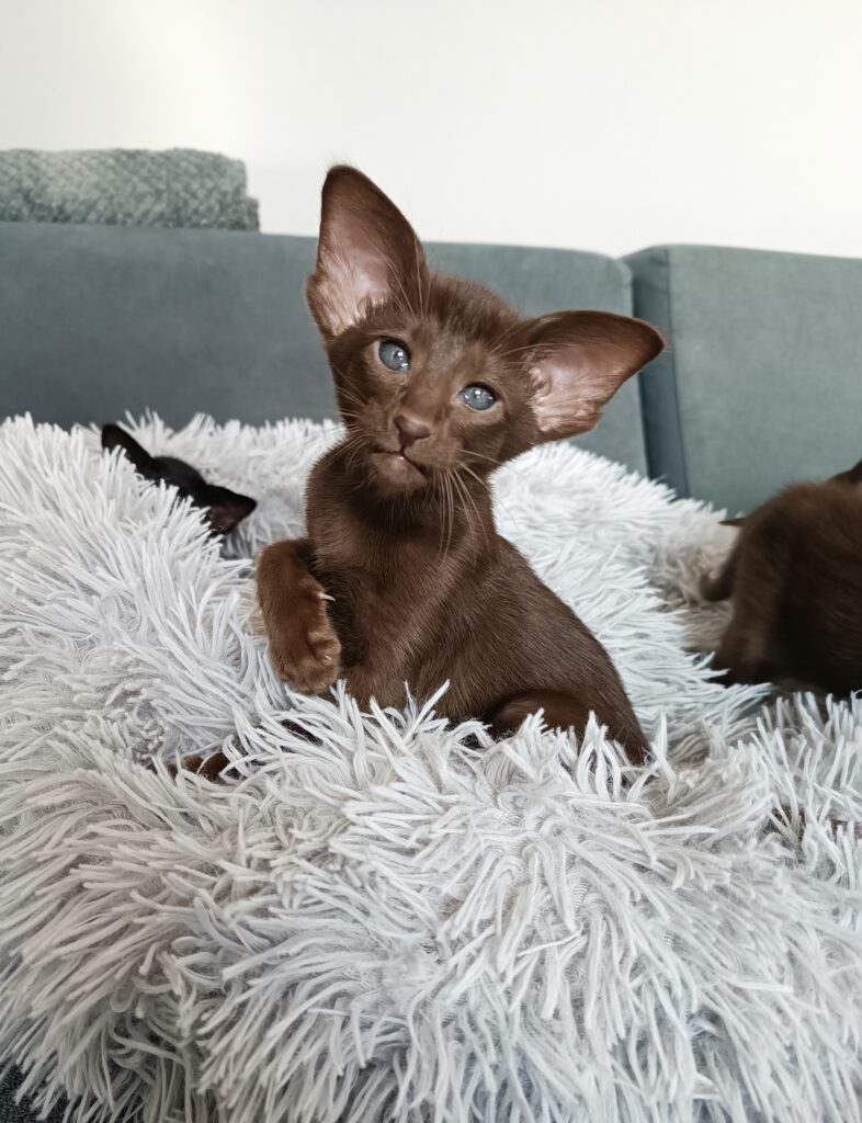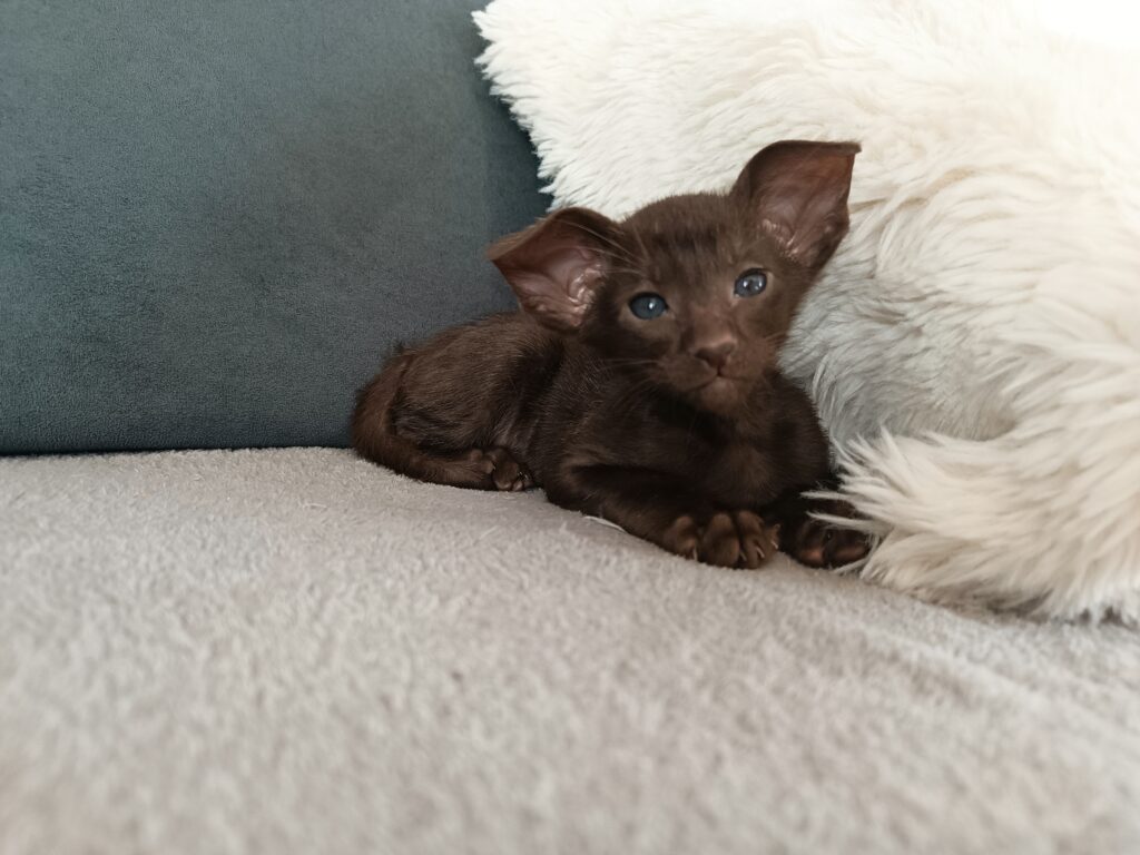 Irma – czekoladowa kotka orientalna (czerwony znacznik) – największy rozbójnik i miłośnik głaskania wśród rodzeństwa. Po domowemu Buła ze względu na swoją tuszę w okresie noworodkowym 😉 Rezerwacja