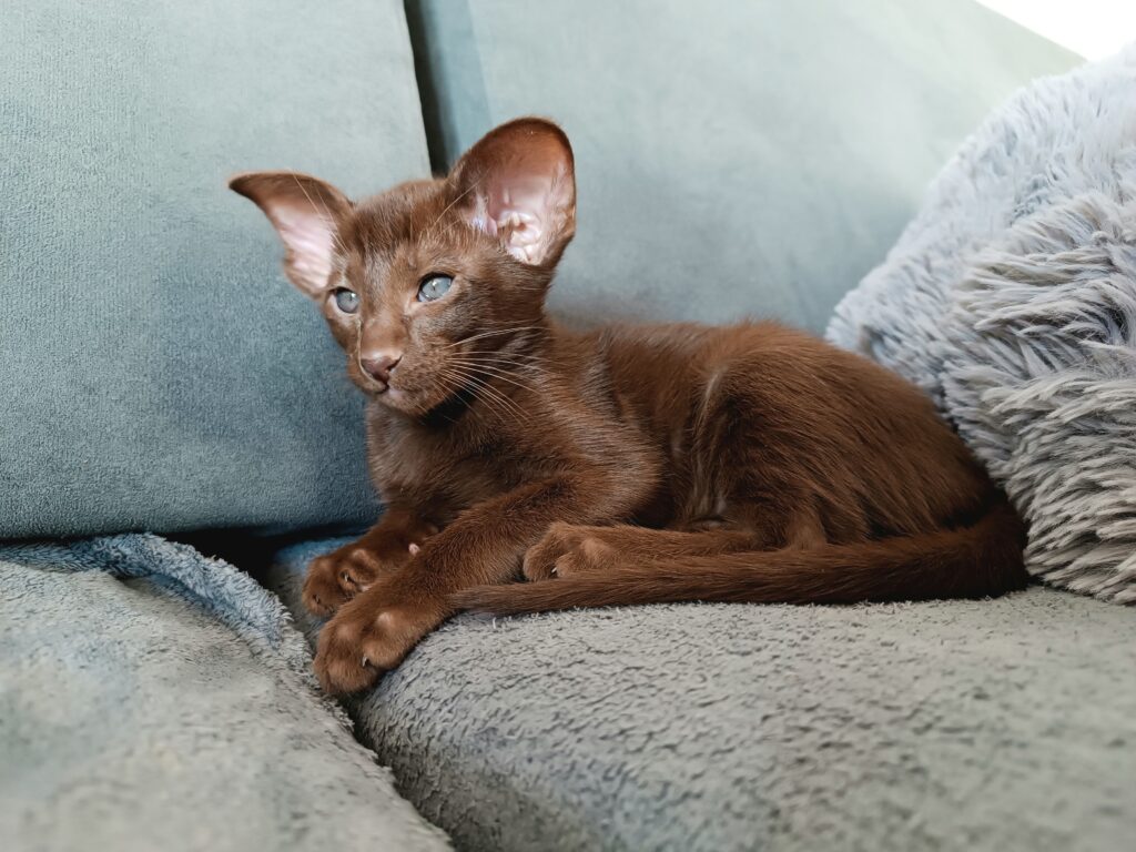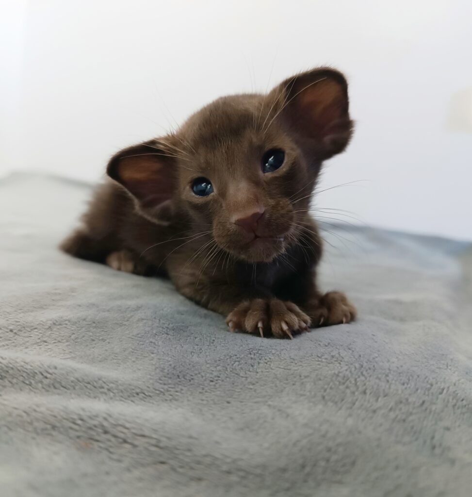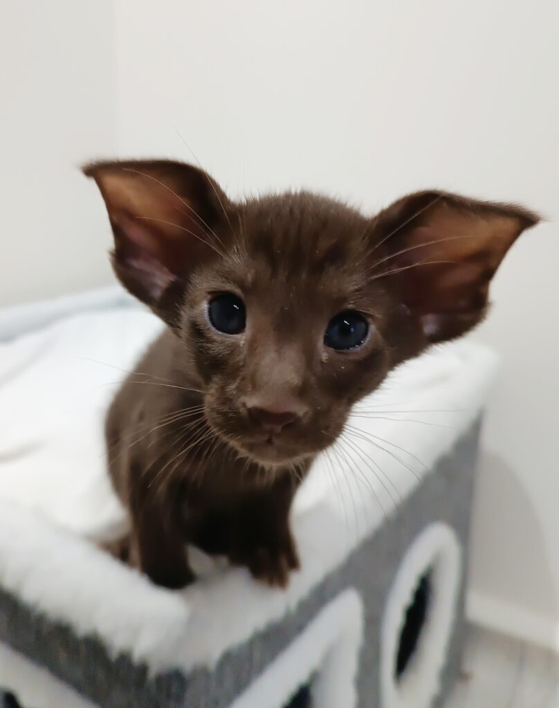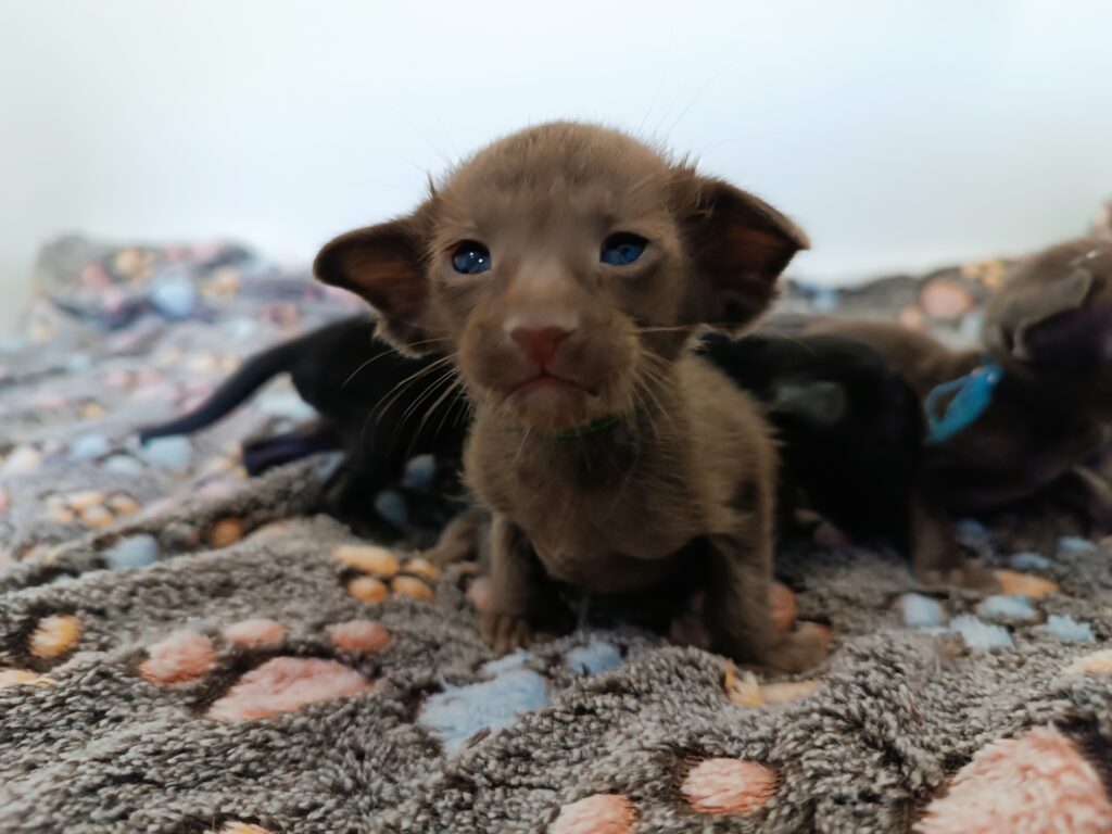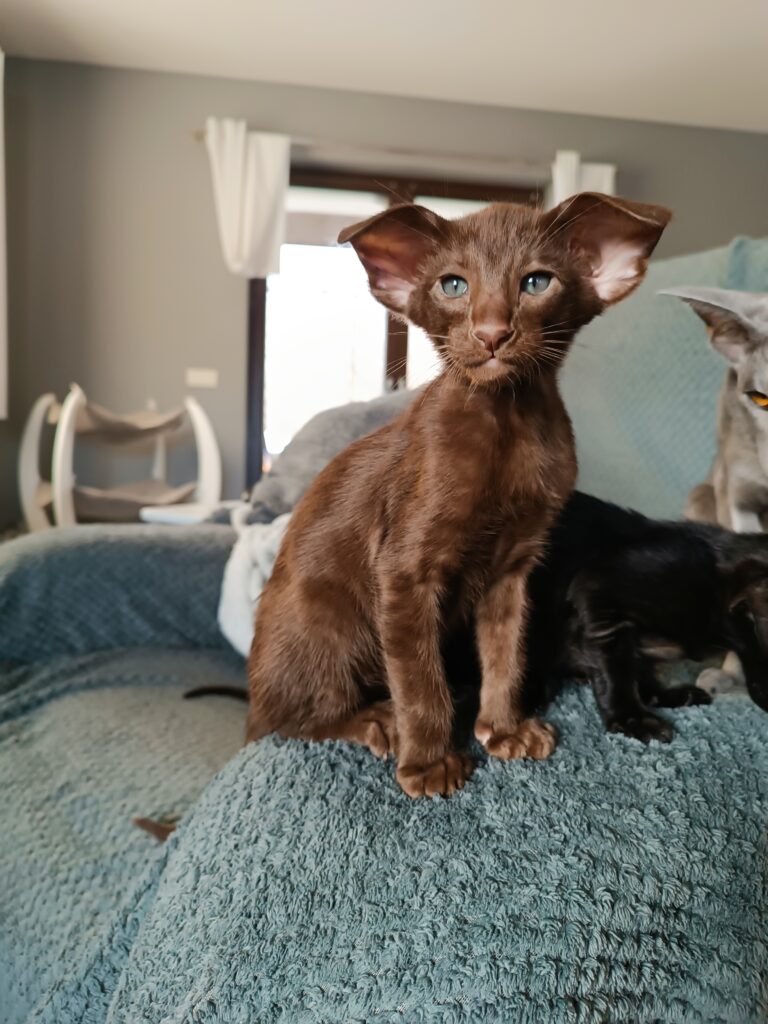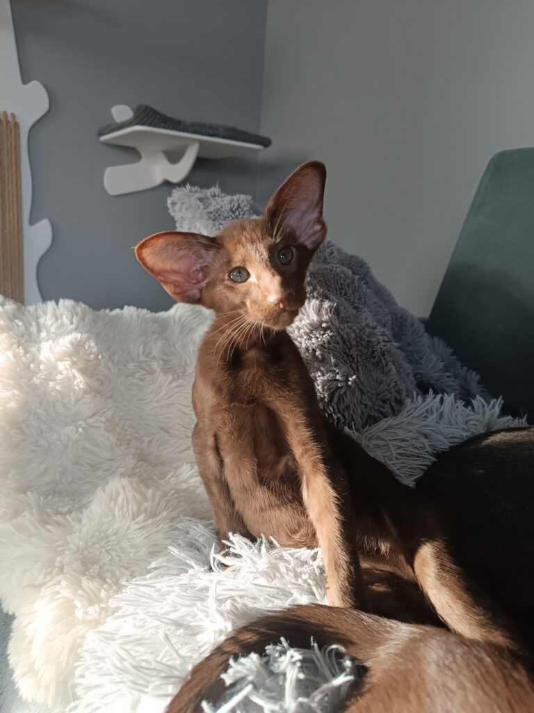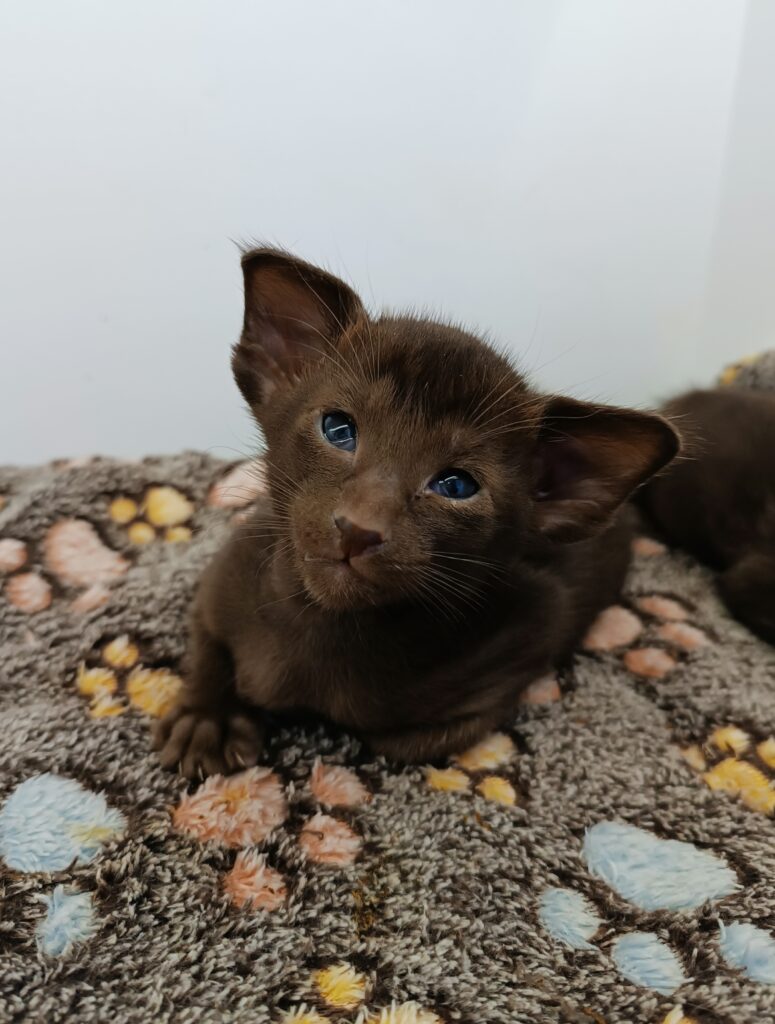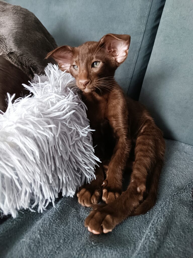 Irma – czekoladowa kotka orientalna (czerwony znacznik) – największy rozbójnik i miłośnik głaskania wśród rodzeństwa. Po domowemu Buła ze względu na swoją tuszę w okresie noworodkowym 😉 Rezerwacja