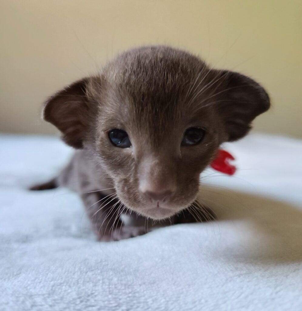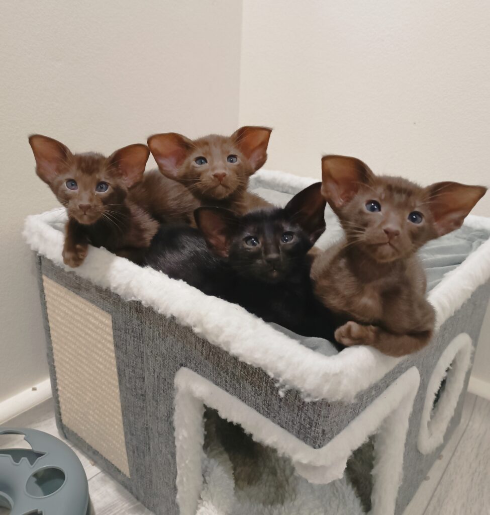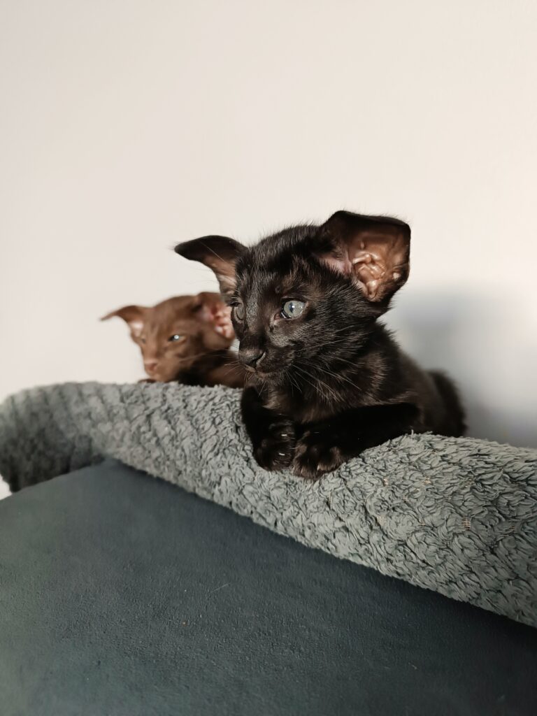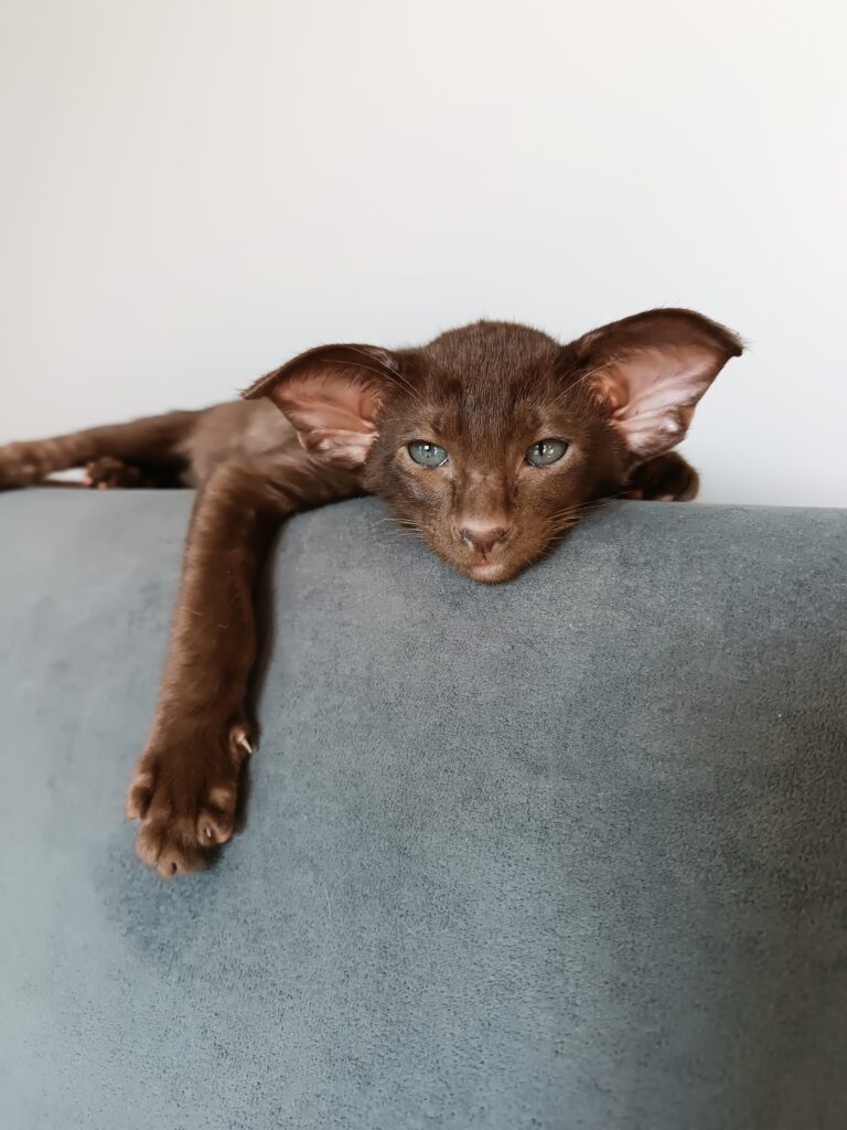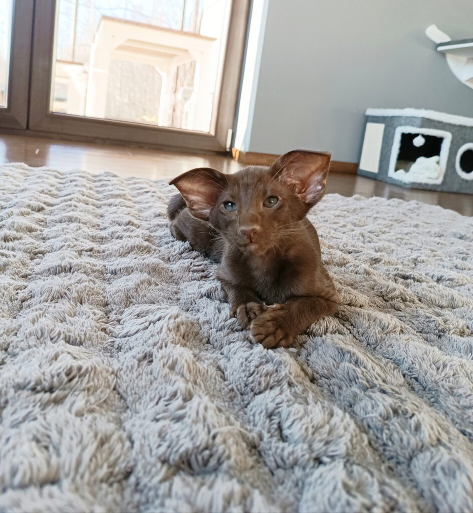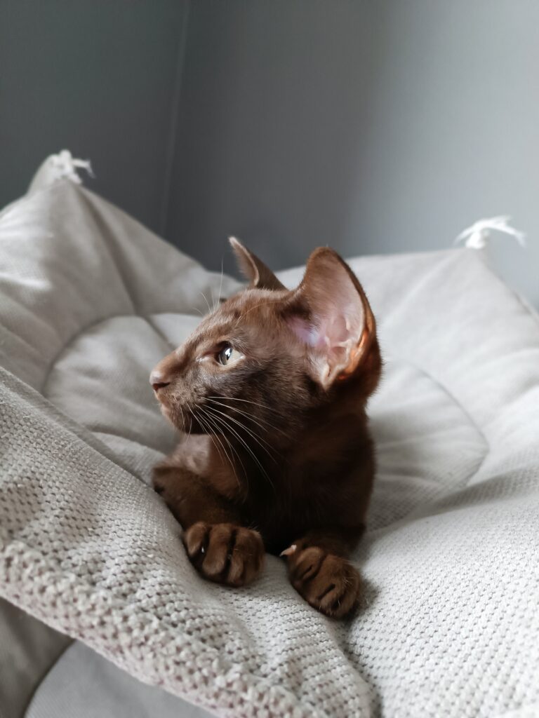 Irma – czekoladowa kotka orientalna (czerwony znacznik) – największy rozbójnik i miłośnik głaskania wśród rodzeństwa. Po domowemu Buła ze względu na swoją tuszę w okresie noworodkowym 😉 Rezerwacja