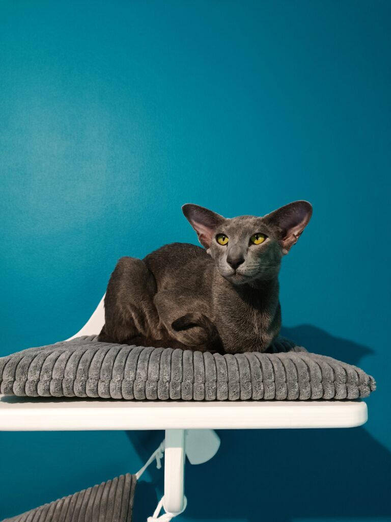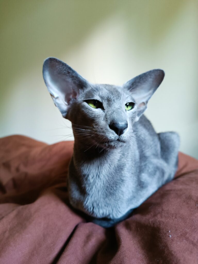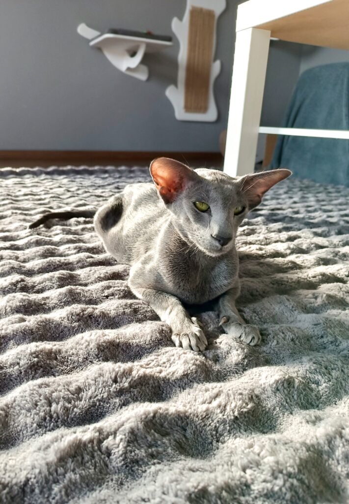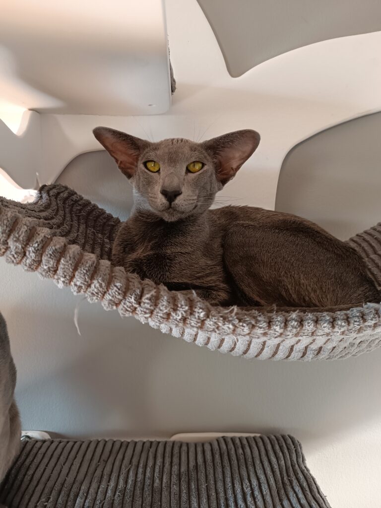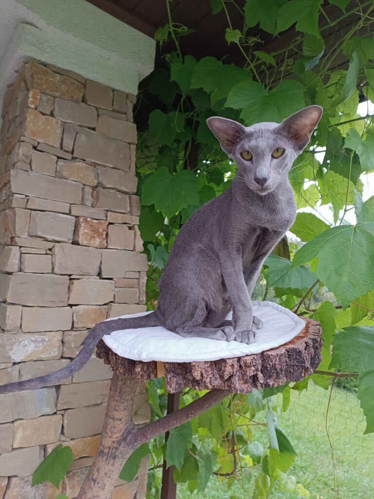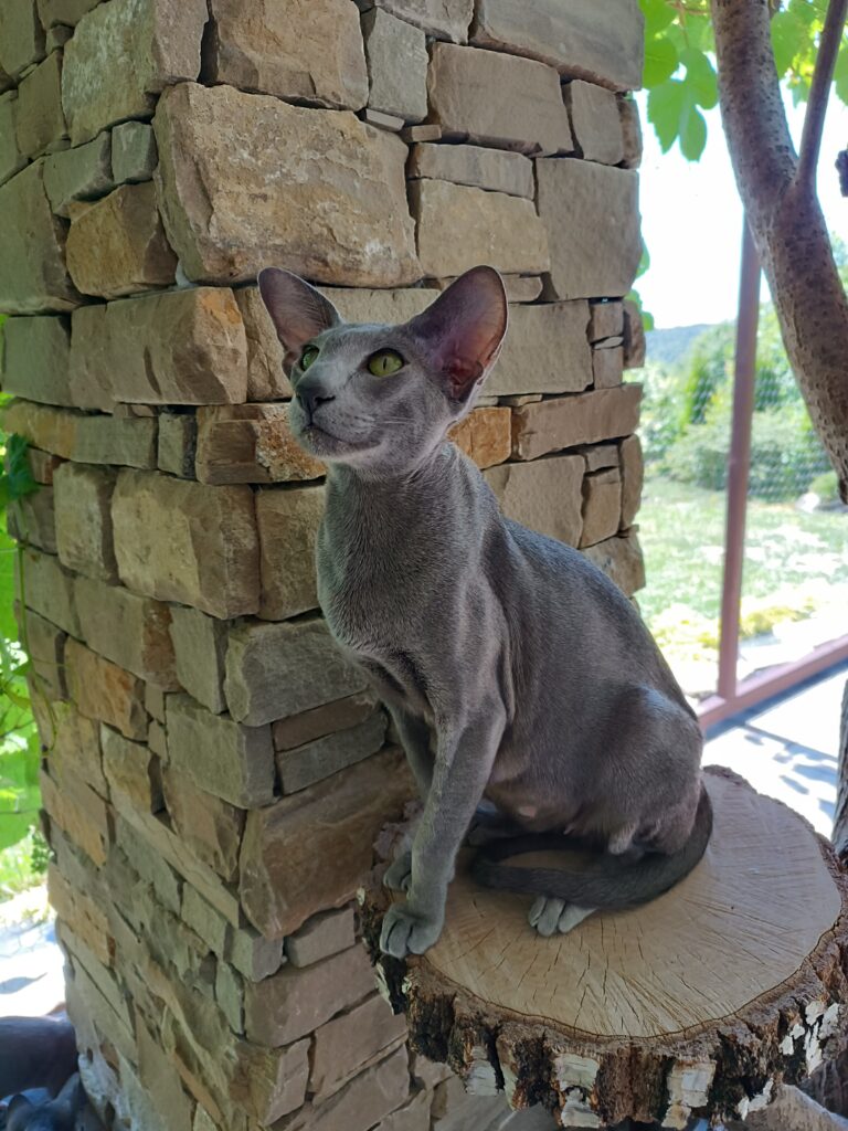Questa to orientalna kotka hodowlana w kolorze niebieskim. Przyjechała do nas z Czelabińska w Rosji, wprowadzając nieco “świeżej krwi” do naszej hodowli. To kotka wyjątkowo lubiąca pieszczoty i nieustannie dopraszająca się o uwagę.