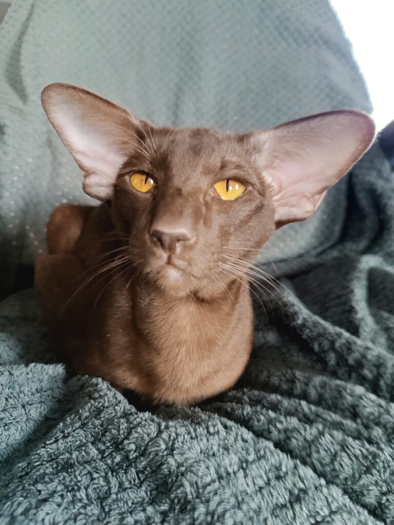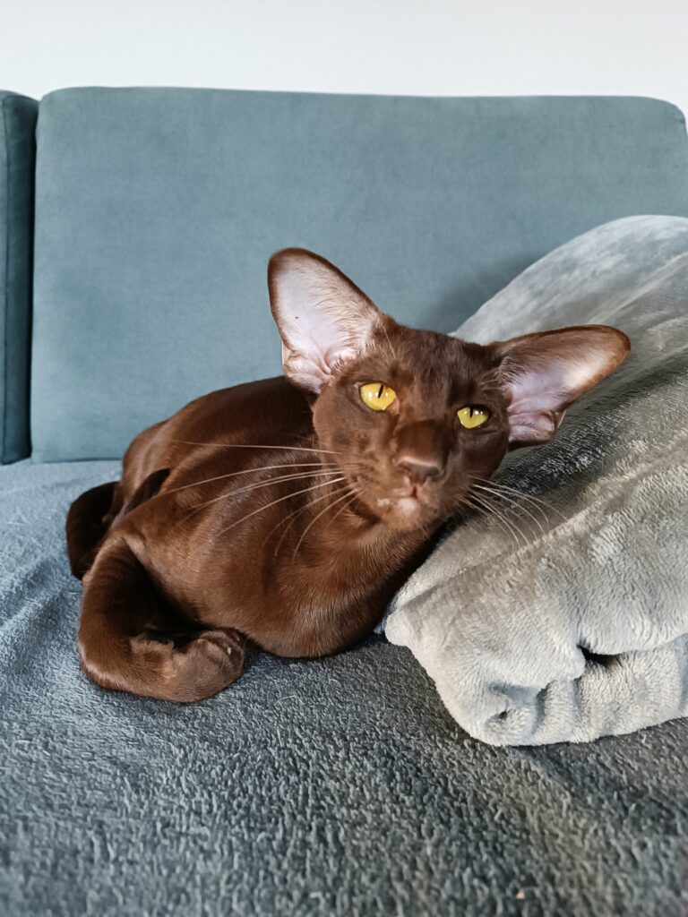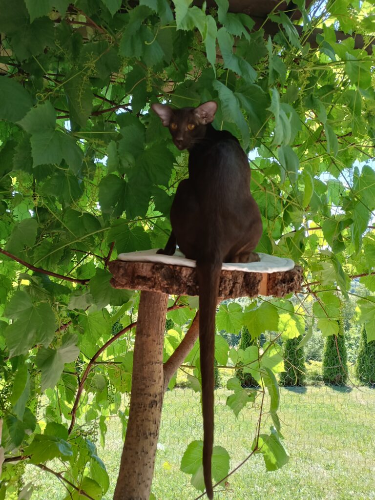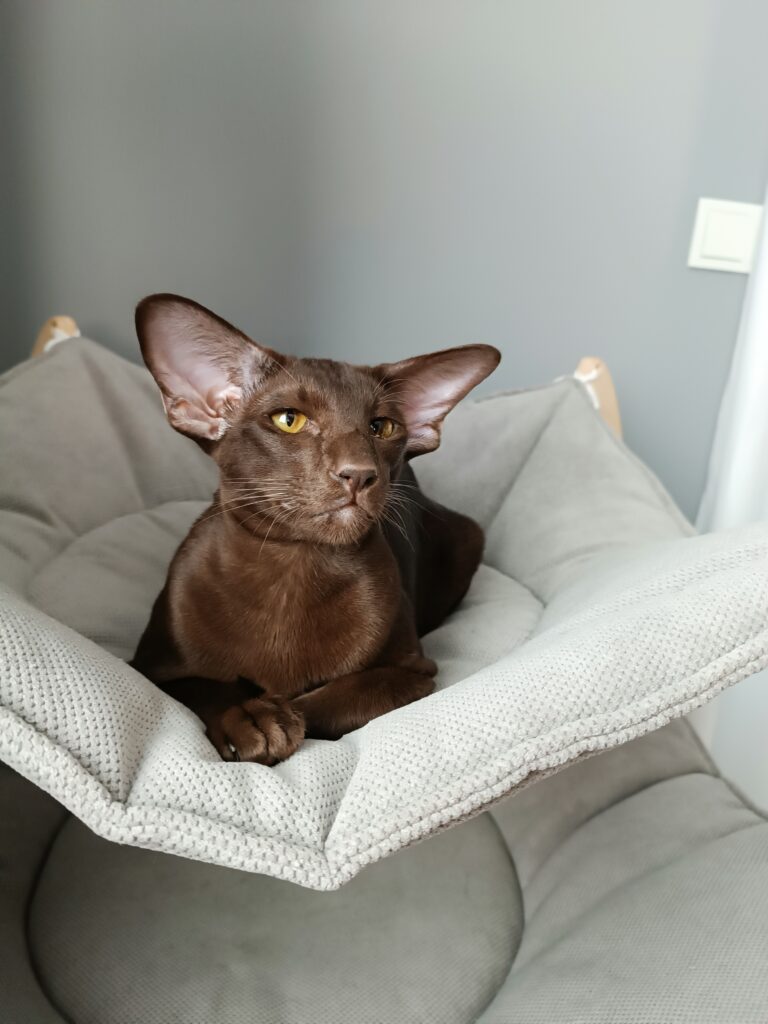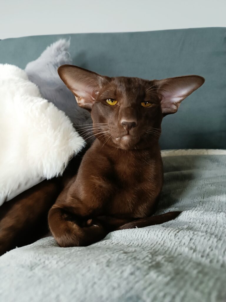 Reno to kocur orientalny w kolorze czekoladowym, który przyjechał do nas z Czech – z okolic Pragi. Cechuje go piękny, ciepły odcień czekolady oraz eleganckie, smukłe i długie ciało. Najbardziej przykuwa jednak wzrok jego ogon, który zdaje się nie mieć końca… 😉 W październiku 2025 roku w naszej hodowli urodziły się jego pierwsze dzieci (miot I), a w przyszłości wiążemy z nim jeszcze trochę planów.