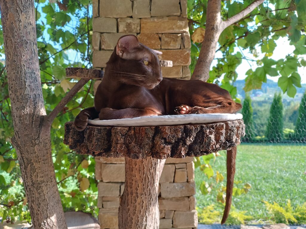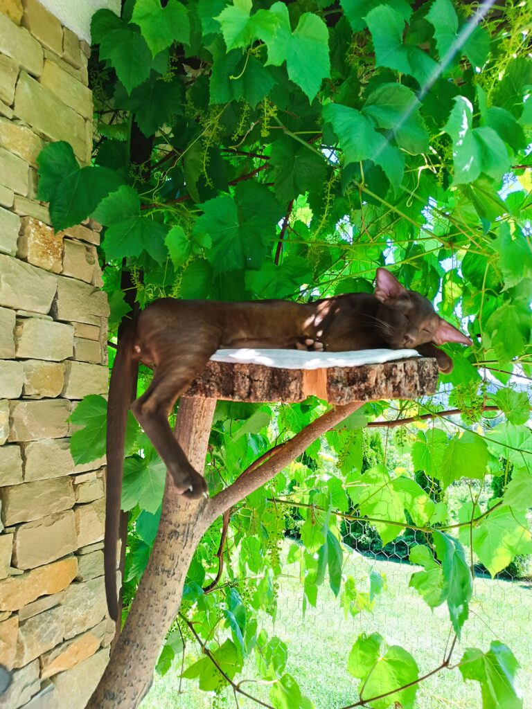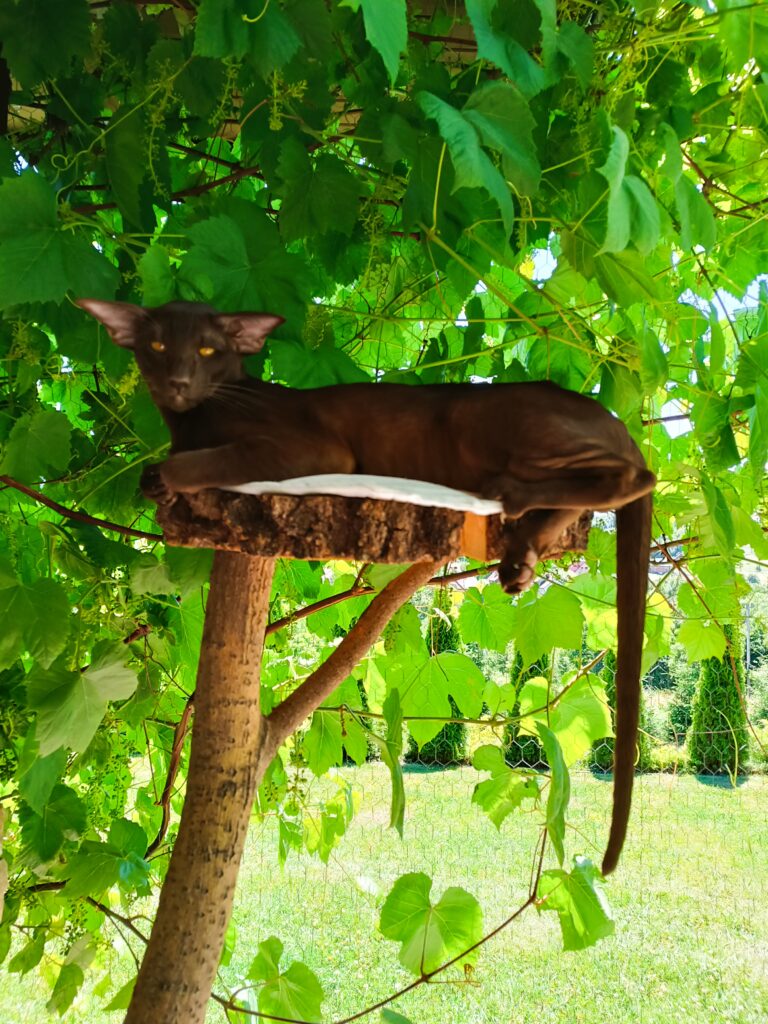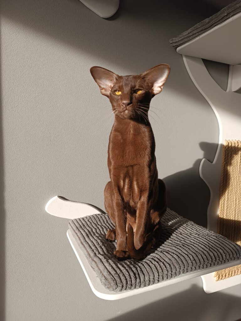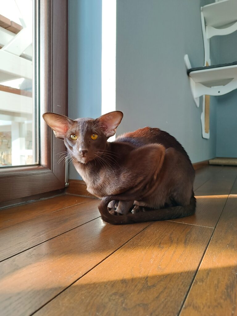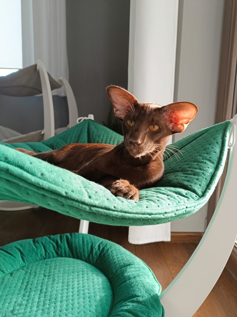 Reno to kocur orientalny w kolorze czekoladowym, który przyjechał do nas z Czech – z okolic Pragi. Cechuje go piękny, ciepły odcień czekolady oraz eleganckie, smukłe i długie ciało. Najbardziej przykuwa jednak wzrok jego ogon, który zdaje się nie mieć końca… 😉 W październiku 2025 roku w naszej hodowli urodziły się jego pierwsze dzieci (miot I), a w przyszłości wiążemy z nim jeszcze trochę planów.